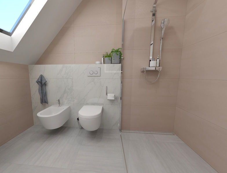 Návrh hlavní koupelny do rodinného domu v Jevíčku se nese ve velmi jemném a ženském duchu. V koupelně se snoubí světlounce růžové, bílé a mramorové odstíny se zařízením nejvyšší kvality značek Villeroy & Boch, Hansgroge a nádherných světel od italského designera. Jak u úložné skříně pod umyvadlem, tak na zrcadlo s osvětlením, byla použita opět značka Villeroy & Boch a koupelna je promyšlena do posledního detailu včetně háčků na ručníky.